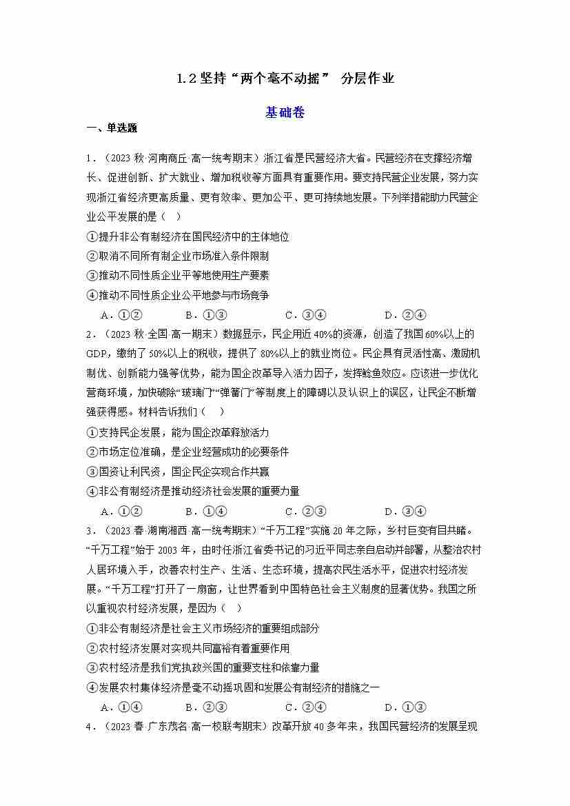 1.2坚持“两个毫不动摇”(分层作业)原卷版