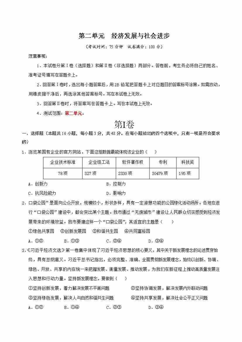 首页 > 全部 > 单元测试 > 第二单元 经济发展与社会进步 (单元测试·基础卷)(学生版)