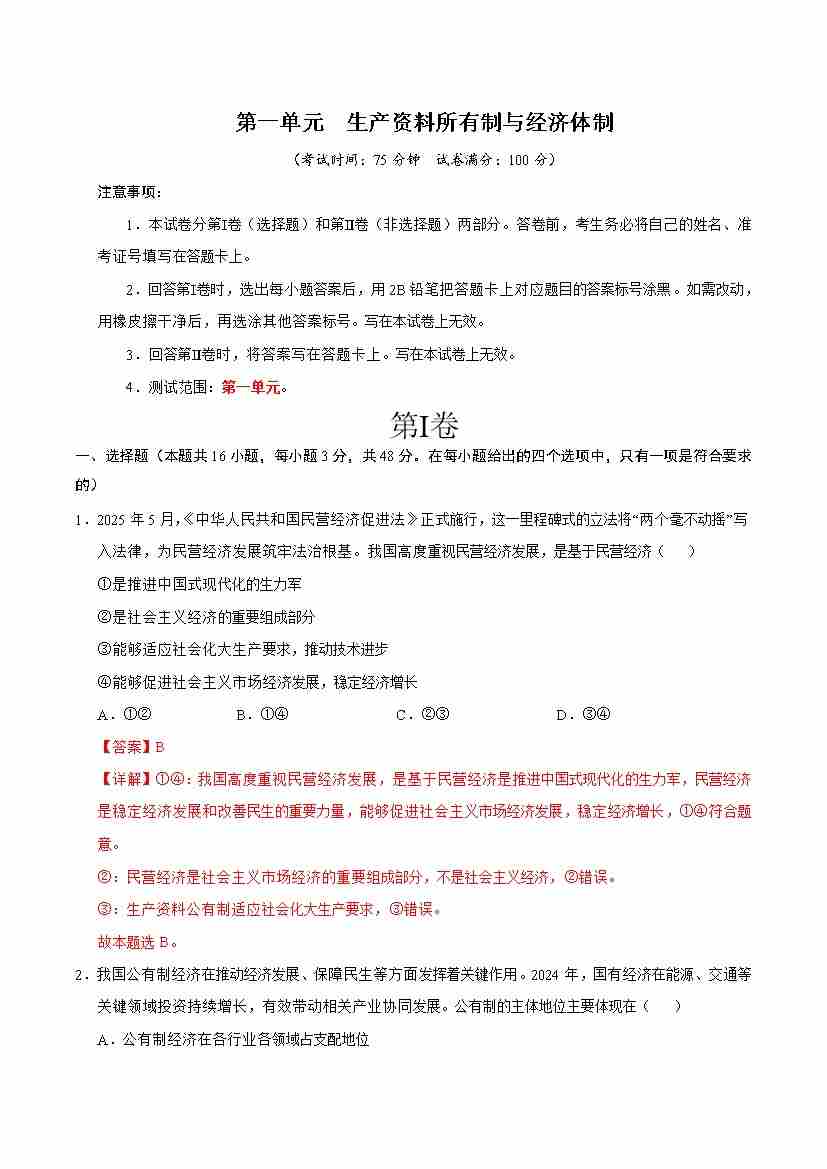 第一单元 生产资料所有制与经济体制 (单元测试·基础卷)(教师版)