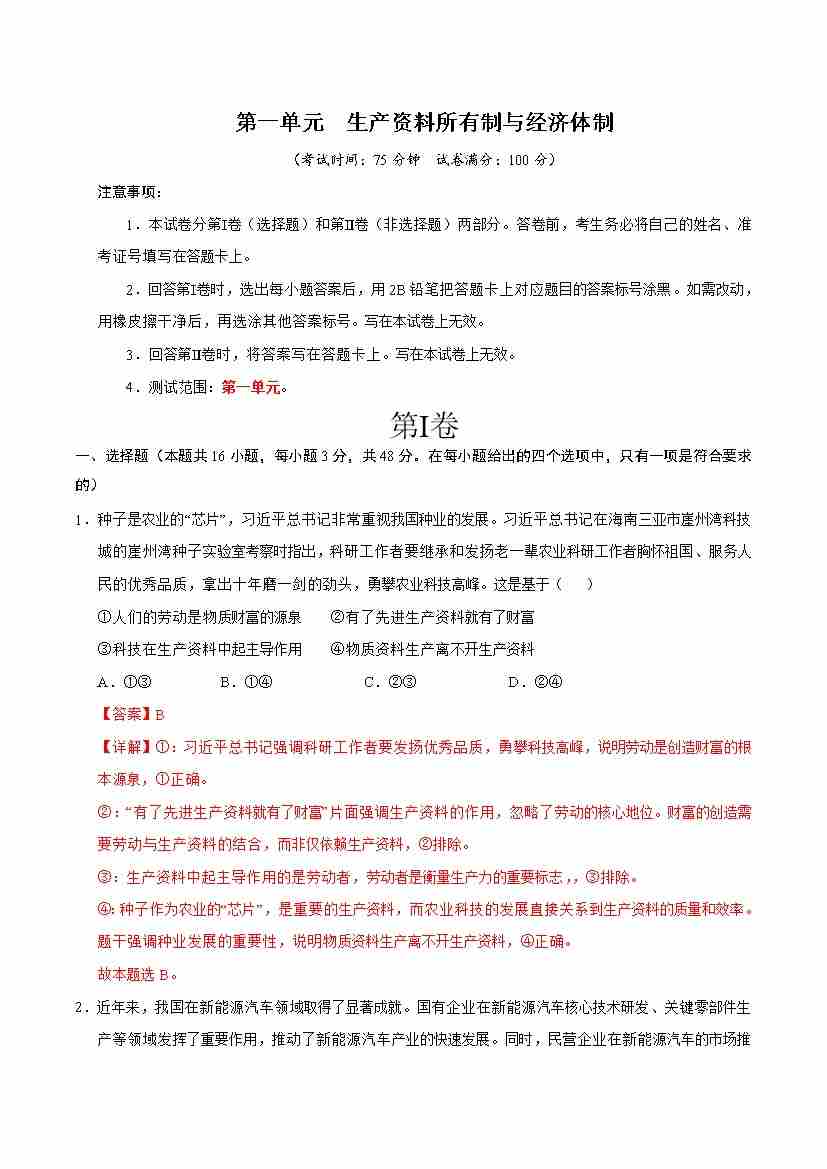 第一单元 生产资料所有制与经济体制 (单元测试·提升卷)(教师版)