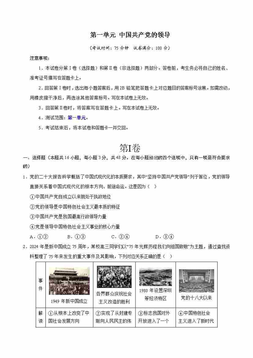 第一单元中国共产党的领导(单元测试·提升卷)(学生版)