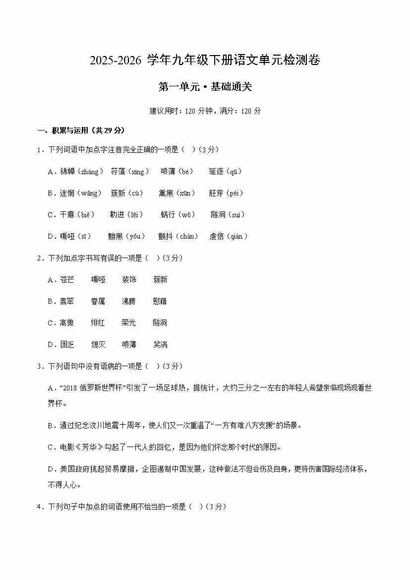 首页 > 全部 > 单元试卷 > 九下语文第一单元测试·基础卷(考试版A4)