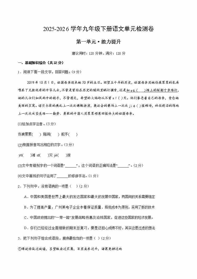 首页 > 全部 > 单元试卷 > 九下语文第一单元测试·提升卷(考试版A4)