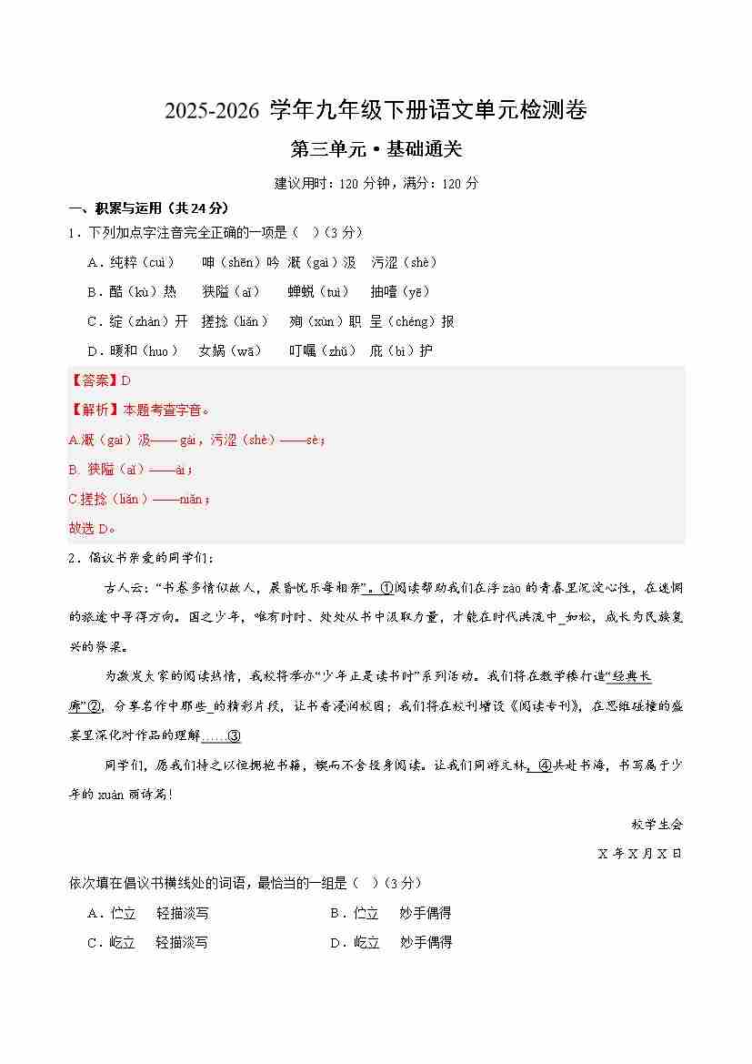 首页 > 全部 > 单元试卷 > 九下语文第三单元测试·基础卷(解析版)