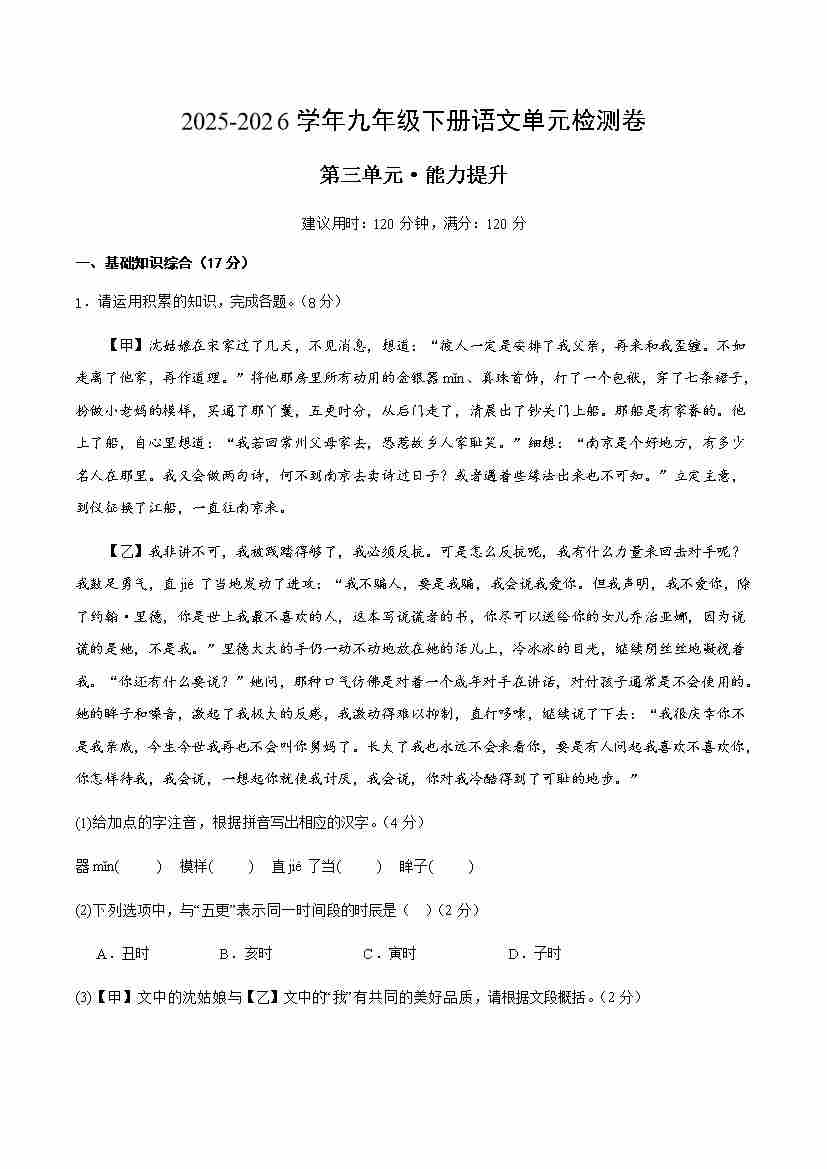 首页 > 全部 > 单元试卷 > 九下语文第三单元测试·提升卷(考试版A4)