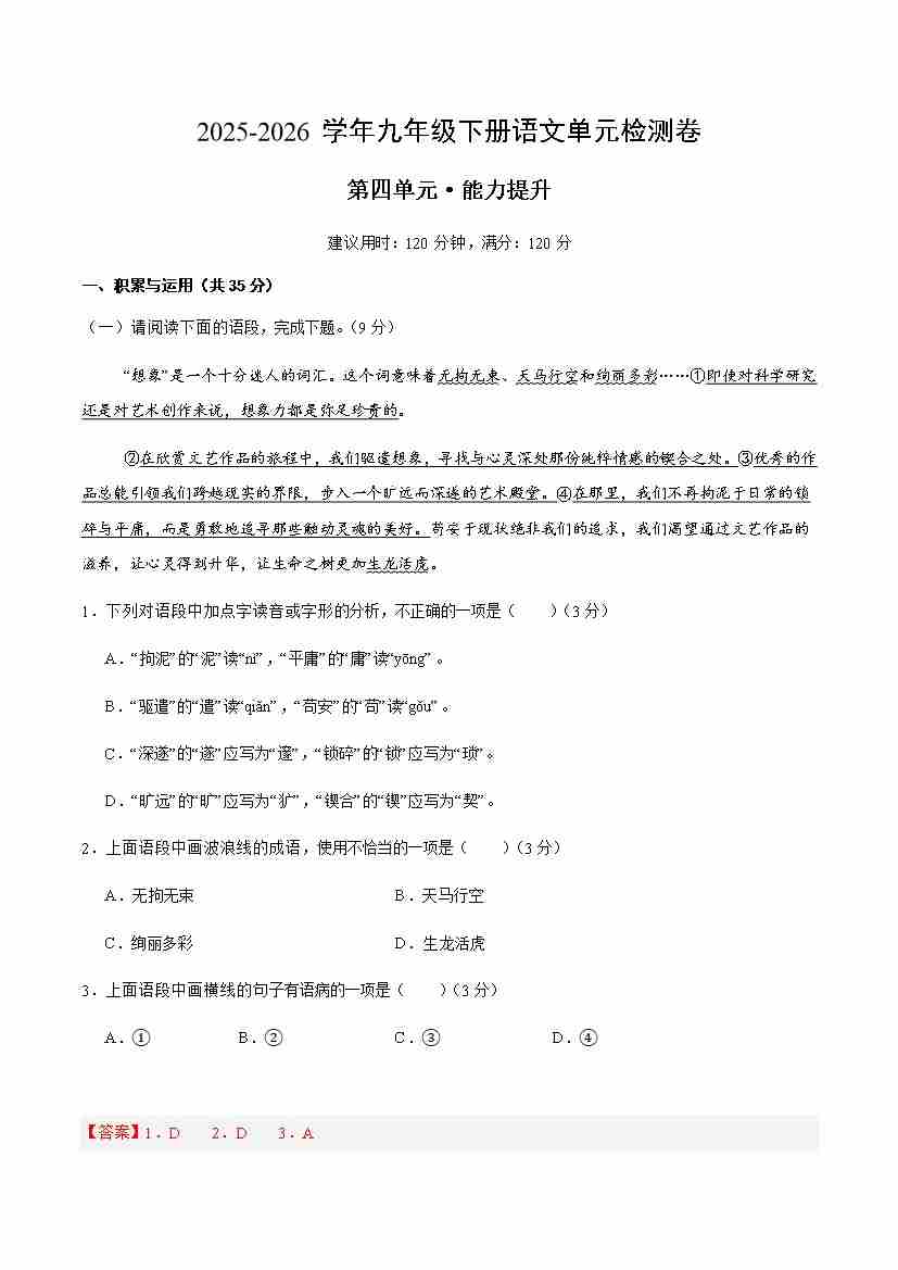首页 > 全部 > 单元试卷 > 九下语文第四单元测试·提升卷(解析版)
