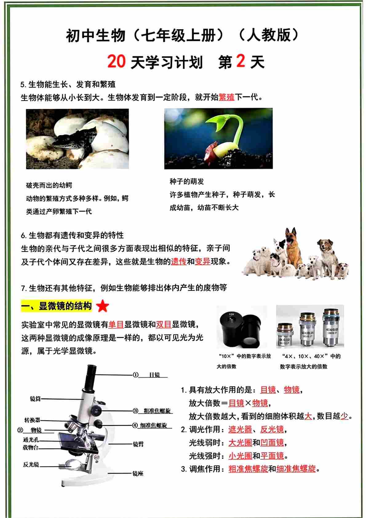 七上生物 (新人教版)20 天学习计划答案版