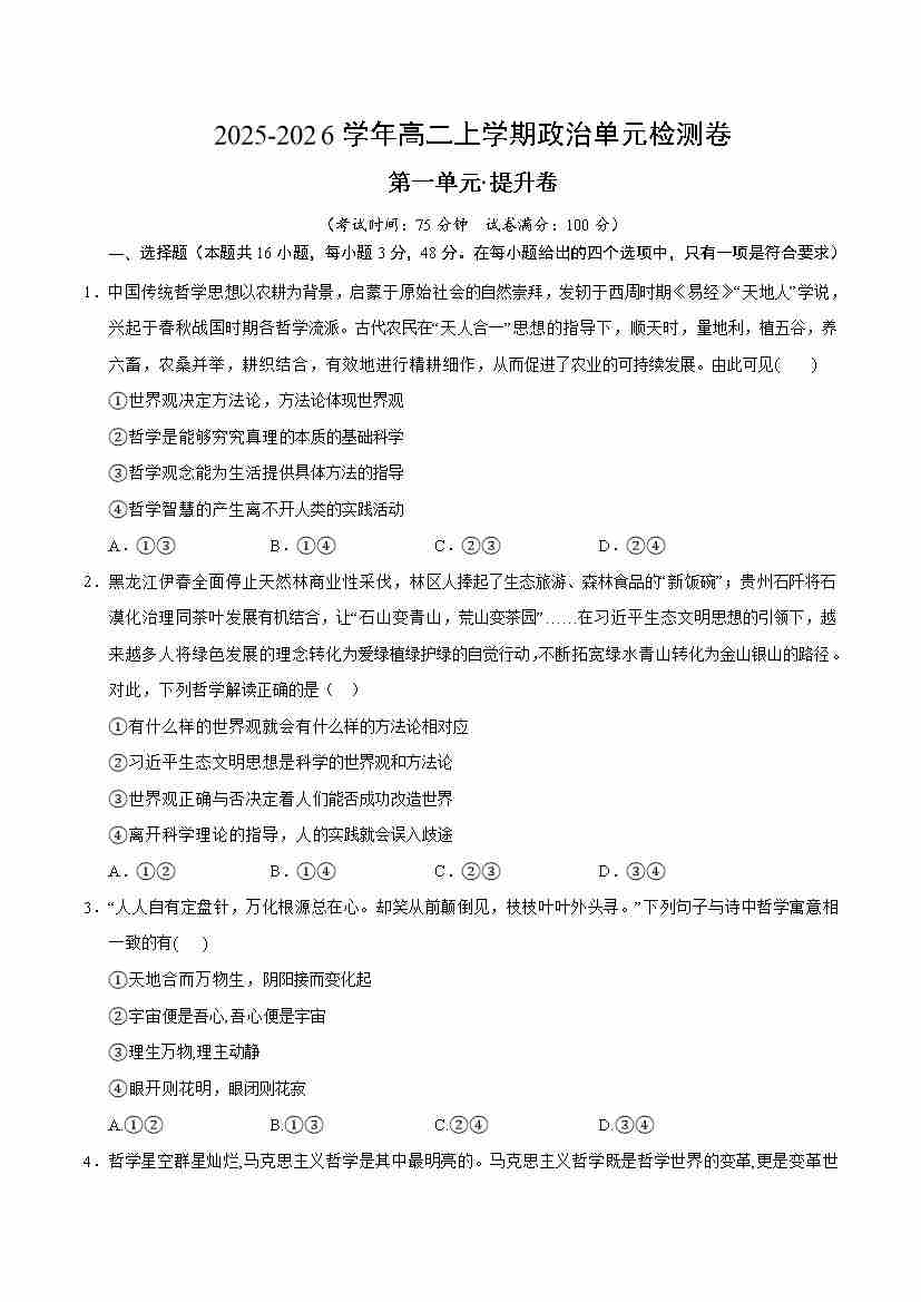 第一单元 探索世界与把握规律(单元测试·提升卷)(考试版A4)