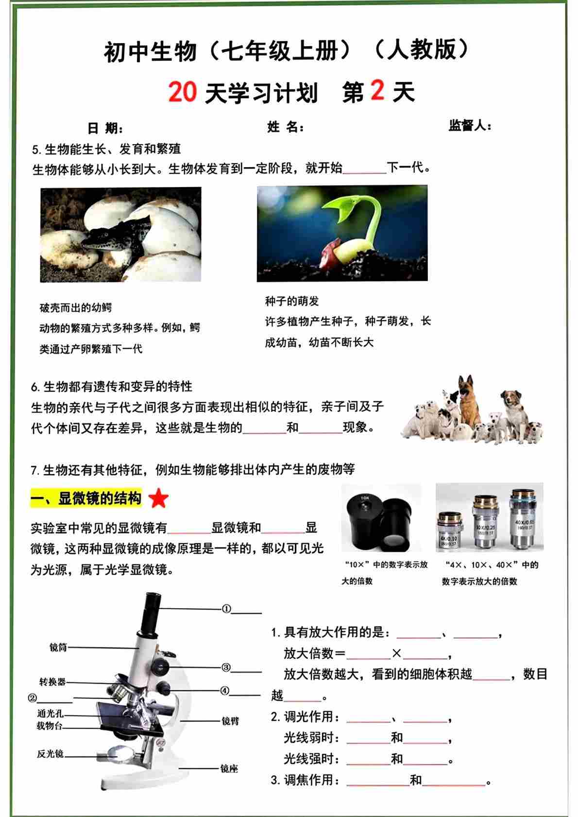 七上生物 (新人教版)20 天学习计划空白版