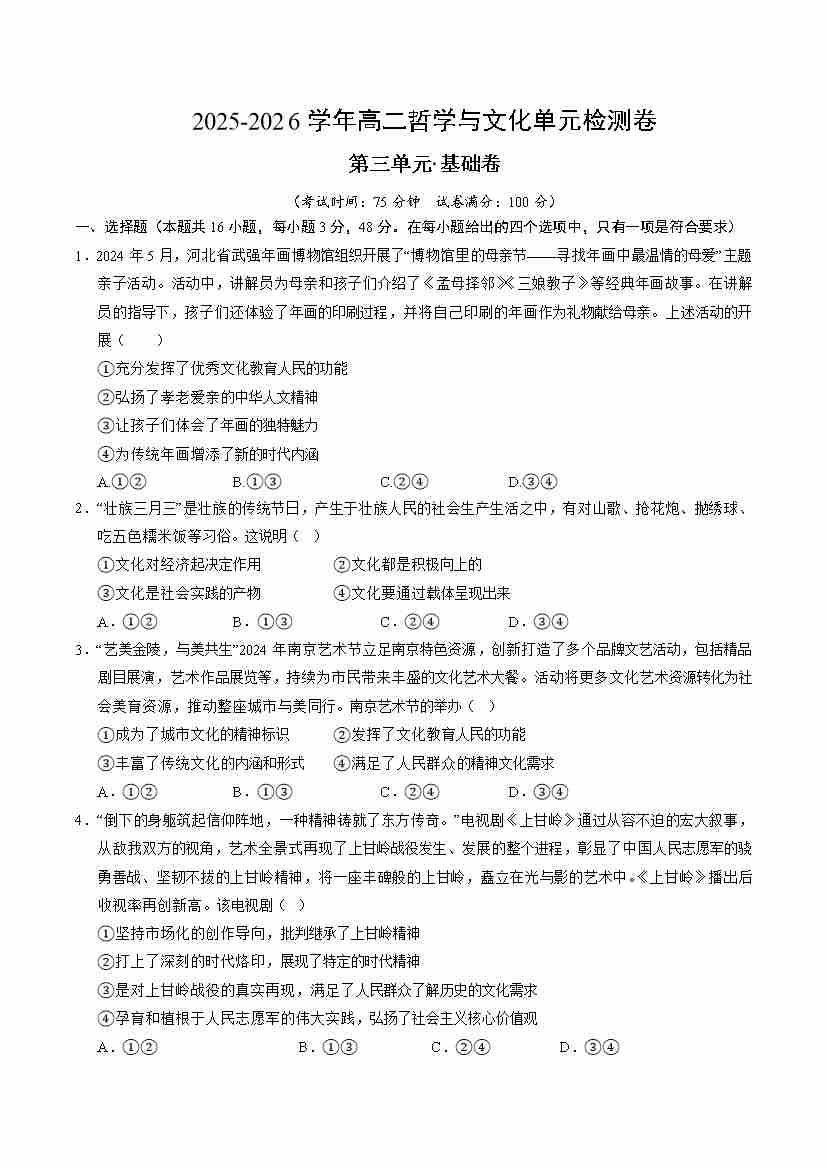 首页 > 全部 > 单元测试 > 第三单元 文化传承与文化创新(单元测试·基础卷)(考试版A4)