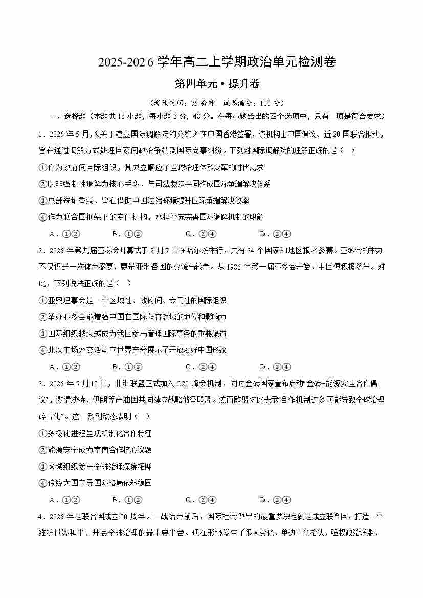 首页 > 全部 > 单元测试 > 第四单元 国际组织(单元测试·提升卷)(原卷版)