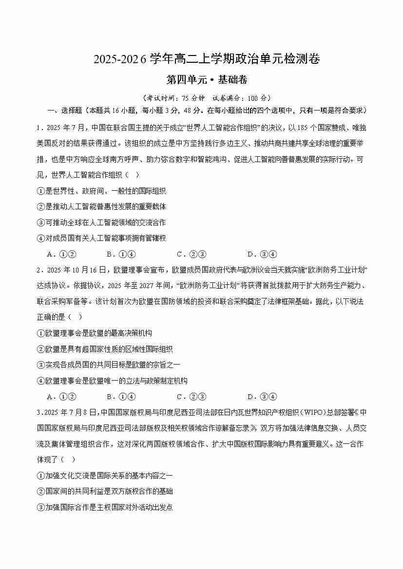 首页 > 全部 > 单元测试 > 第四单元 国际组织(单元测试·基础卷)(原卷版)