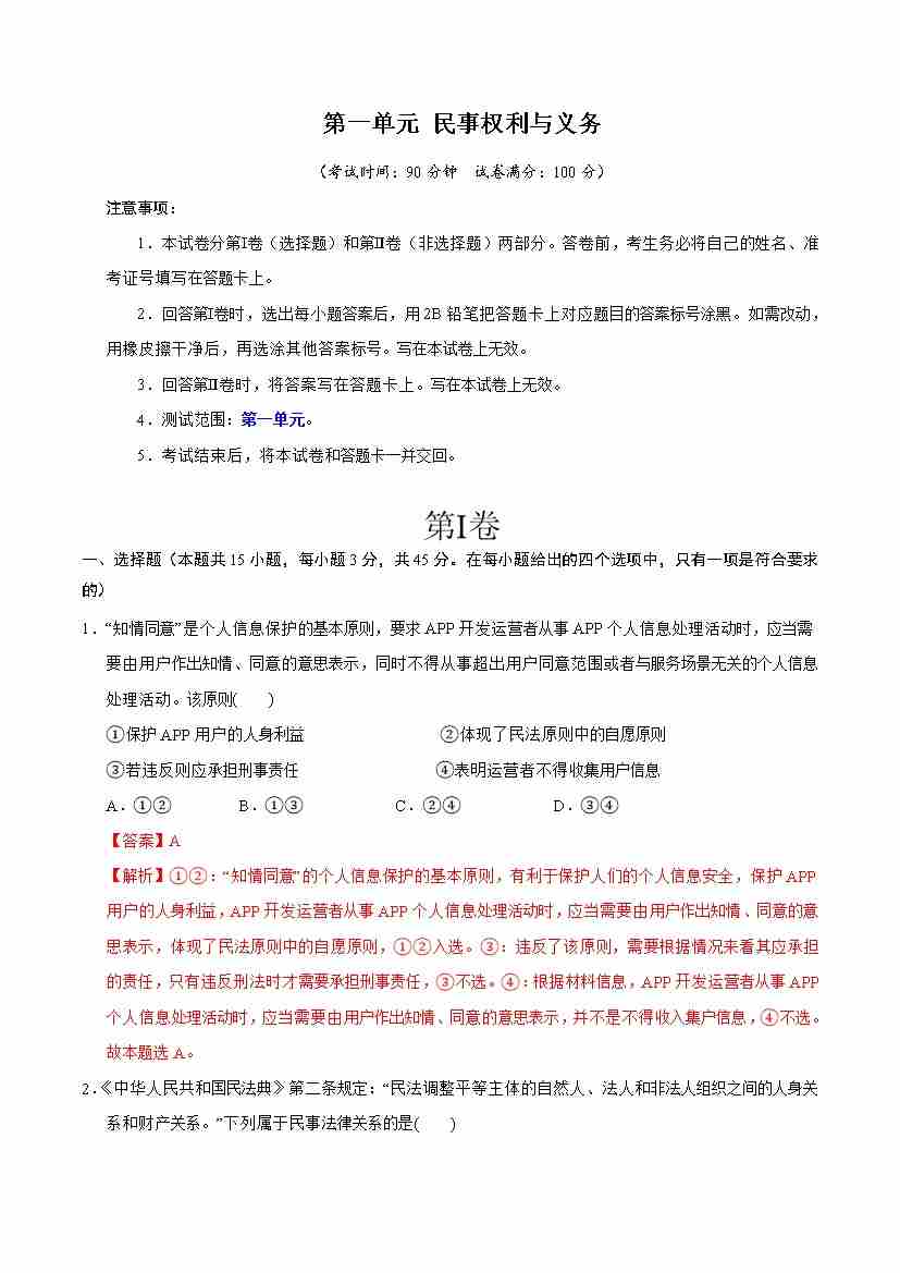 首页 > 全部 > 单元测试 > 第一单元 民事权利与义务 (单元测试·提升卷) (教师版)