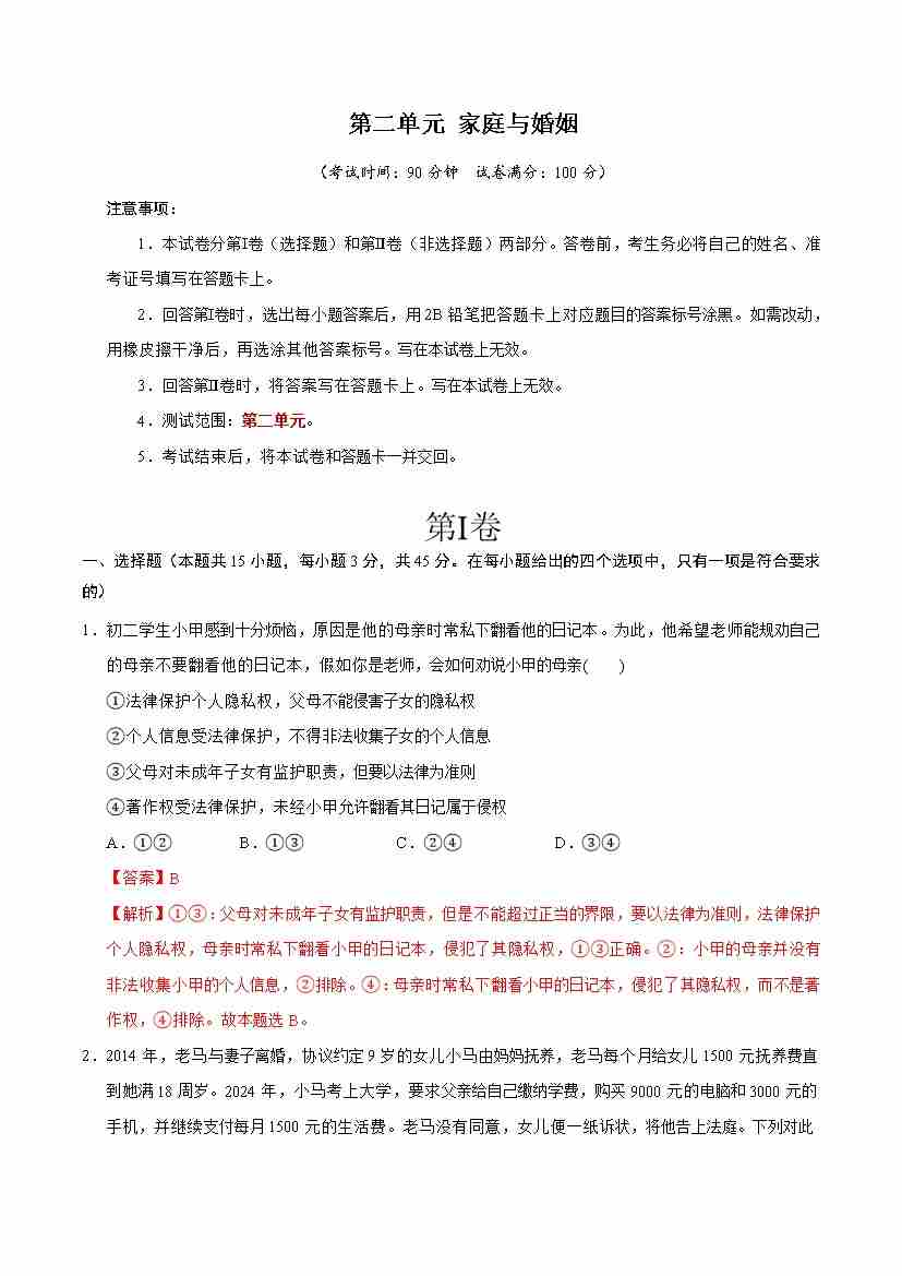 第二单元 家庭与婚姻 (单元测试·基础卷) (教师版)