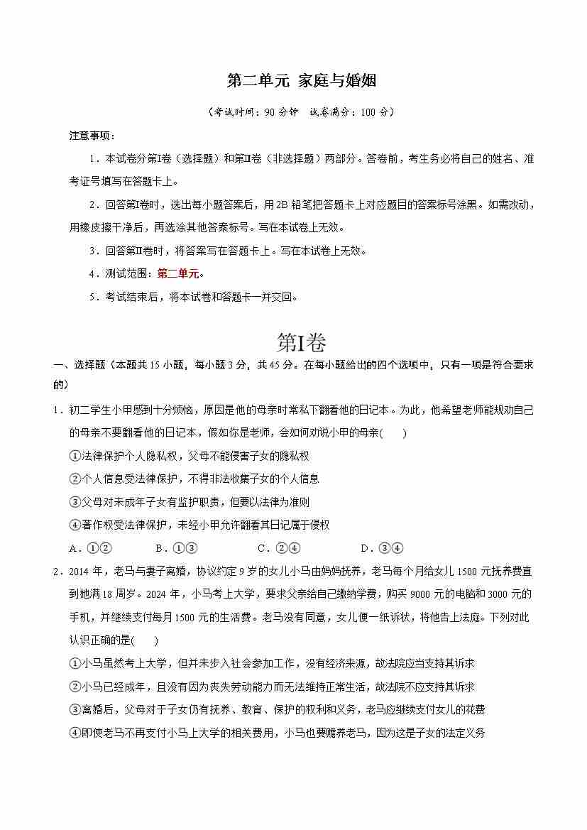 第二单元 家庭与婚姻 (单元测试·基础卷) (学生版)