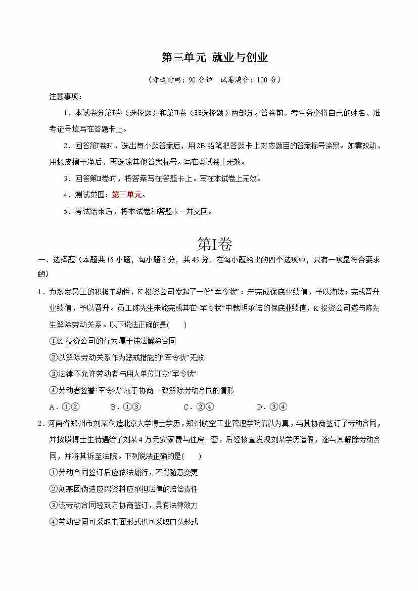 首页 > 全部 > 单元测试 > 第三单元 就业与创业 (单元测试·基础卷) (学生版)