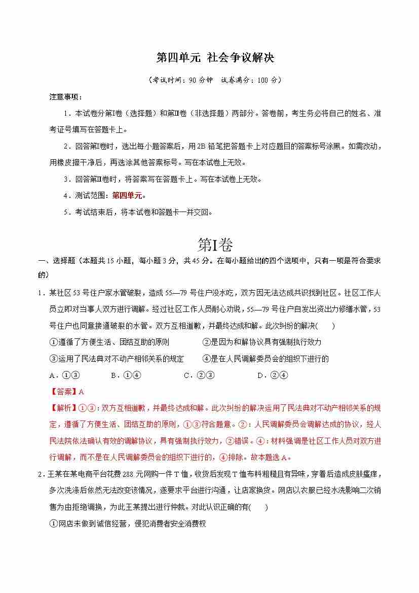首页 > 全部 > 单元测试 > 第四单元 社会争议解决(单元测试·基础卷) (教师版)
