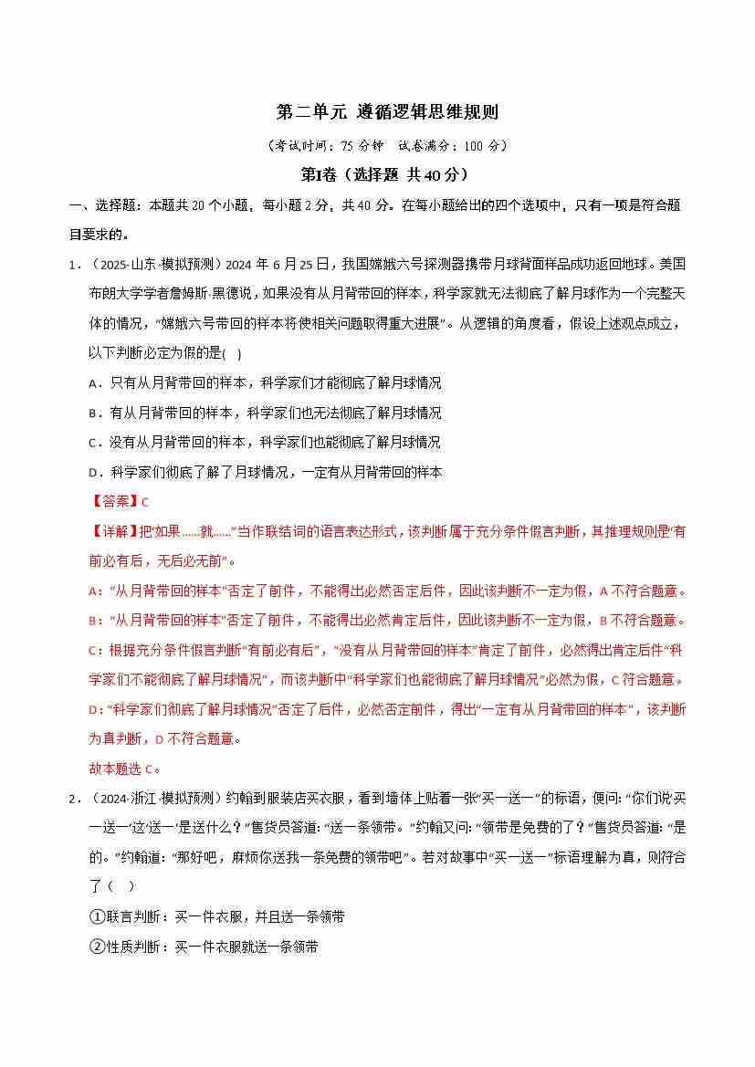 第二单元 遵循逻辑思维规则(单元测试·基础卷)(教师版)