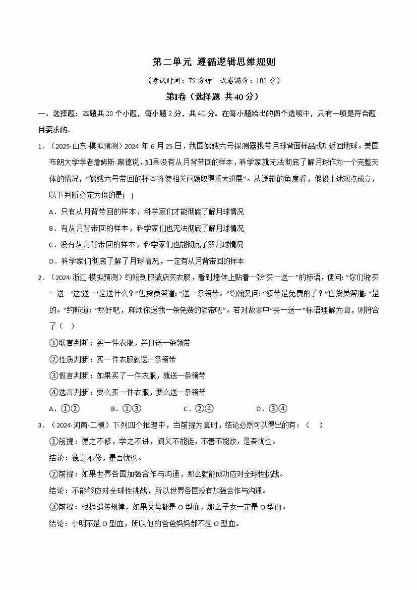 第二单元 遵循逻辑思维规则(单元测试·基础卷)(学生版)
