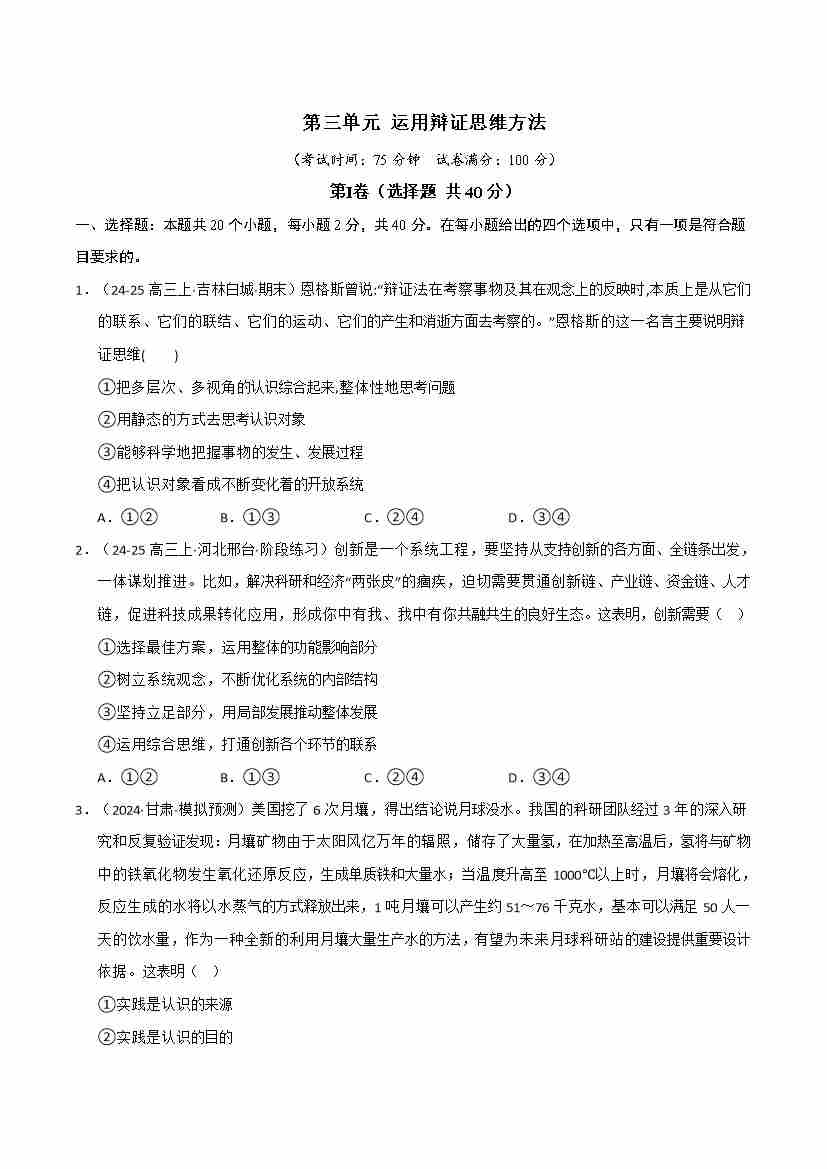 首页 > 全部 > 单元测试 > 第三单元 运用辩证思维方法(单元测试·基础卷)(学生版)