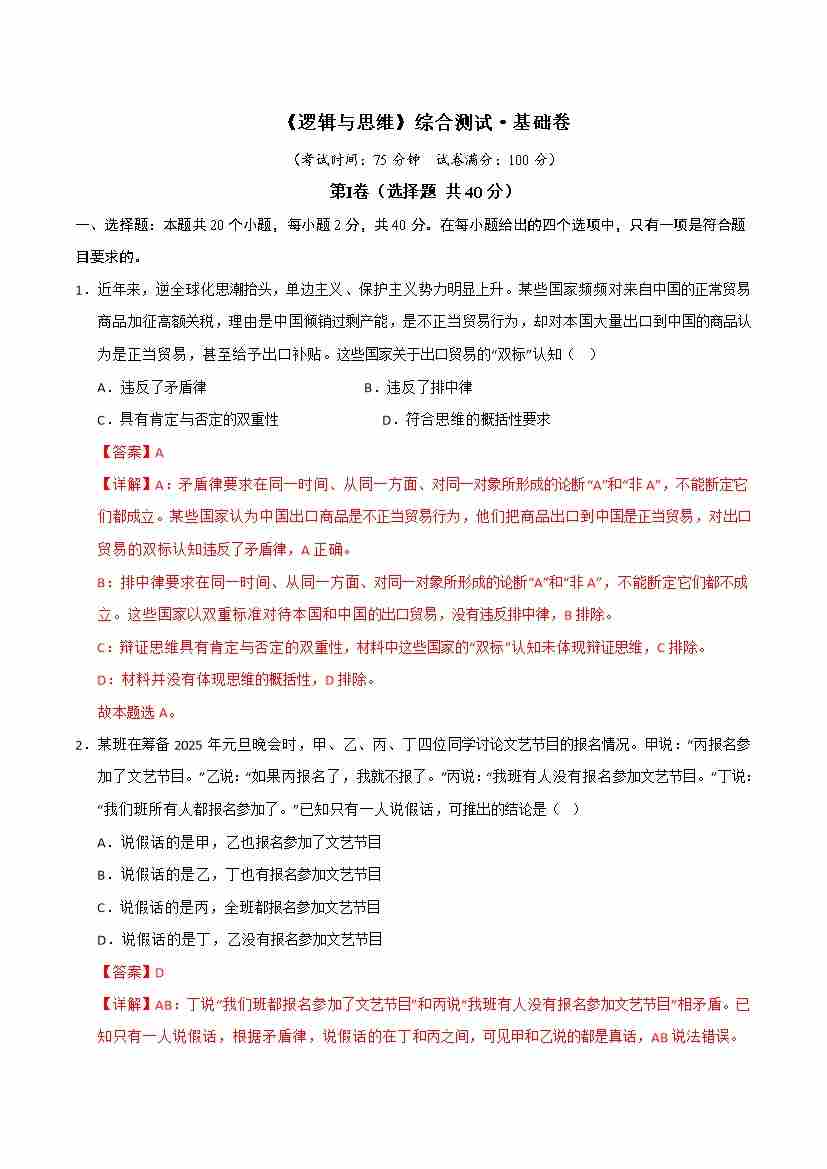《逻辑与思维》(综合测试·基础卷)(教师版)