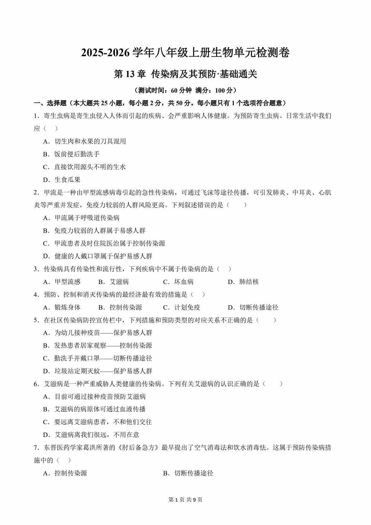 第13章 传染病及其预防(单元测试·基础卷)(考试版A4)---北师版