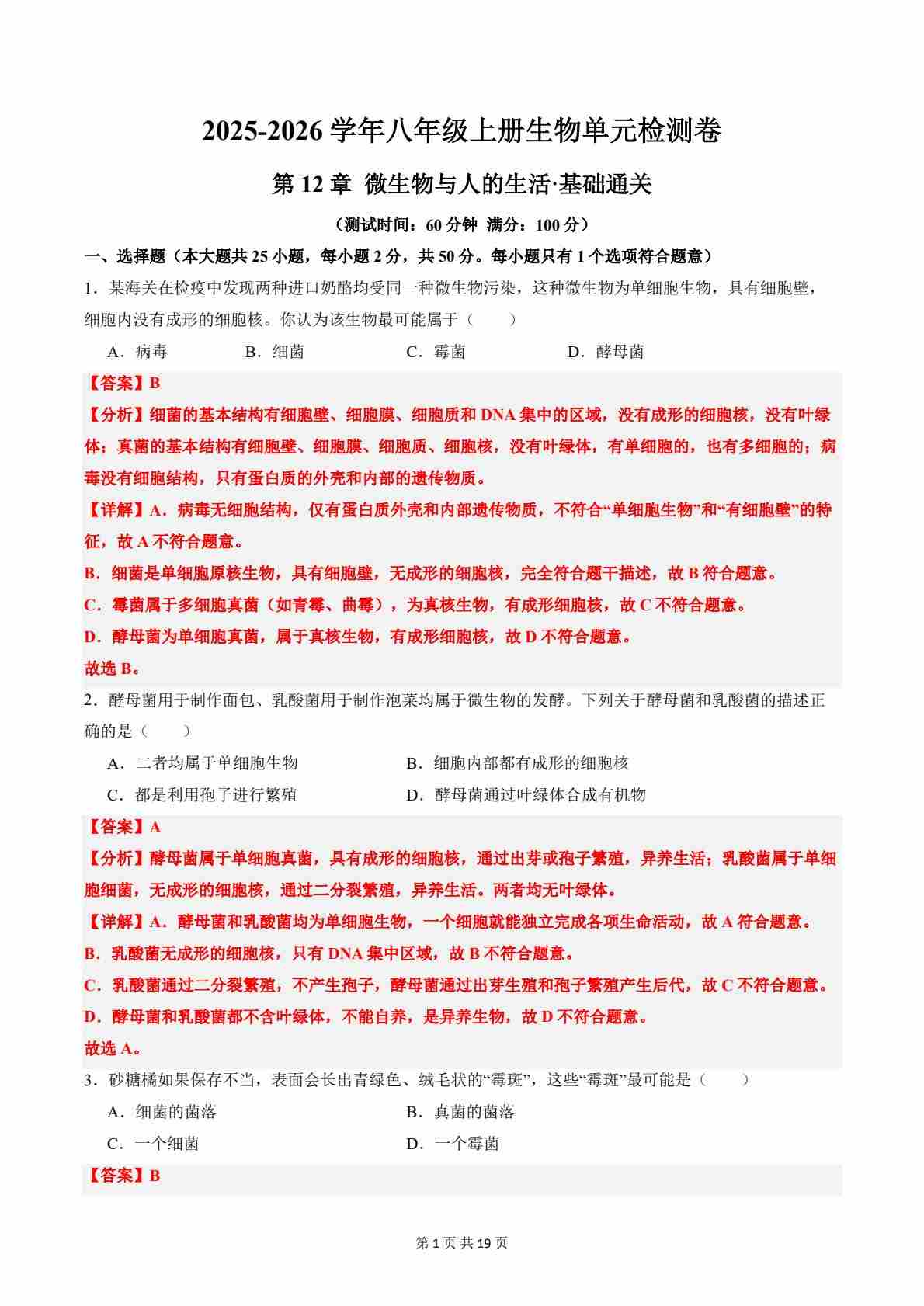 首页 > 全部 > 单元基础卷 > 第12章 微生物与人的生活 (单元测试·基础卷)(解析版)---北师版