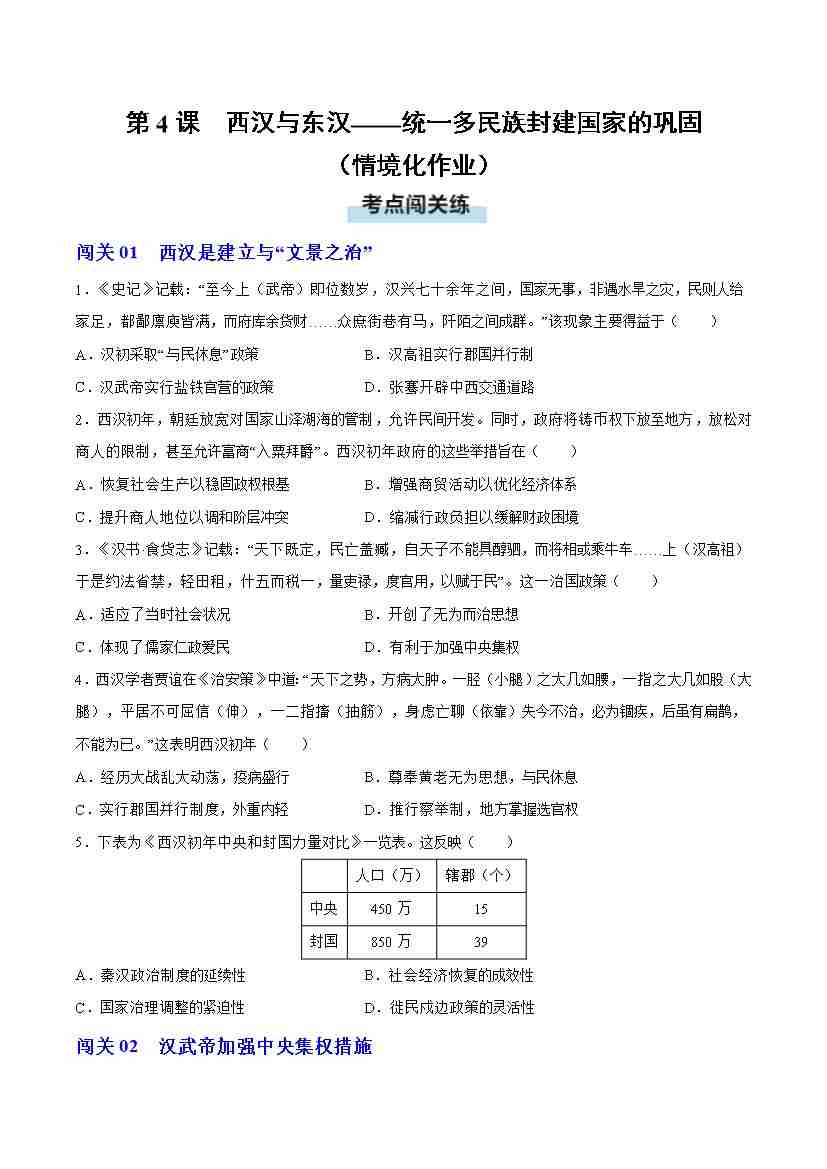 首页 > 全部 > 分层作业 > 第4课 西汉与东汉——统一多民族封建国家的巩固(情境化作业)(原卷版)