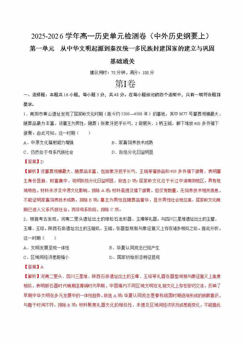 首页 > 全部 > 单元测试 > 第一单元 从中华文明起源到秦汉统一多民族封建国家的建立与巩固(单元测试·基础卷)(教师版)