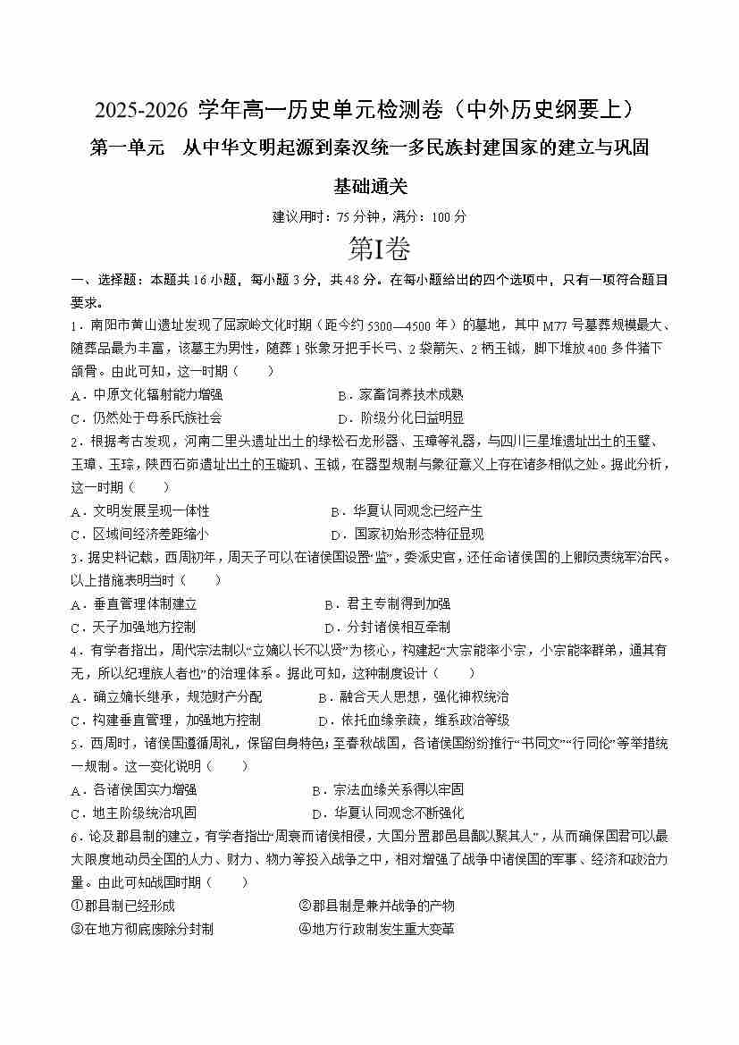 首页 > 全部 > 单元测试 > 第一单元 从中华文明起源到秦汉统一多民族封建国家的建立与巩固(单元测试·基础卷)(考试版A4)