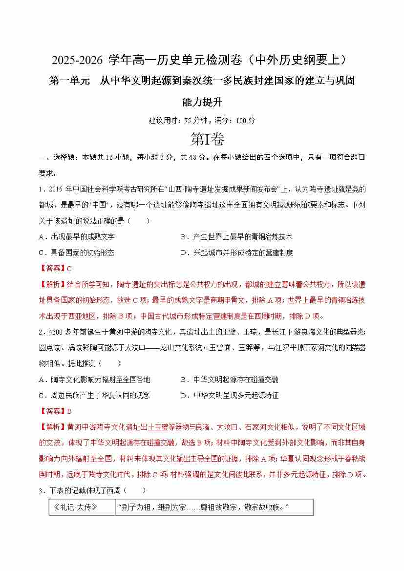第一单元 从中华文明起源到秦汉统一多民族封建国家的建立与巩固(单元测试·提升卷)(教师版)