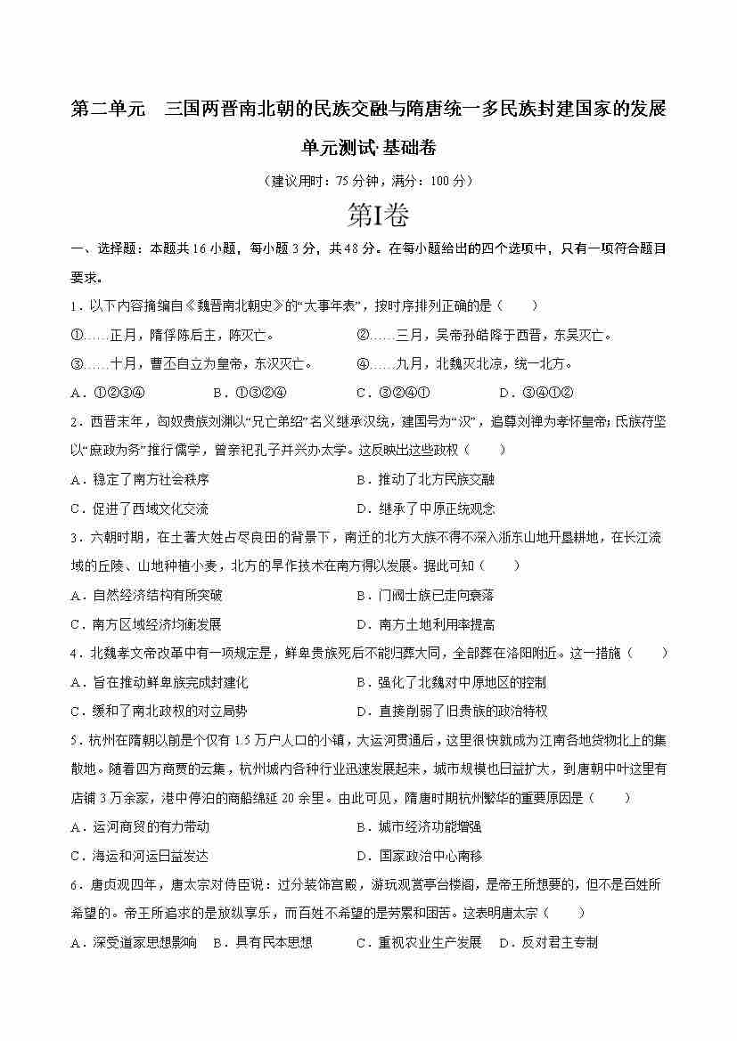 首页 > 全部 > 单元测试 > 第二单元 三国两晋南北朝的民族交融与隋唐统一多民族封建国家的发展(单元测试·基础卷)(考试版A4)