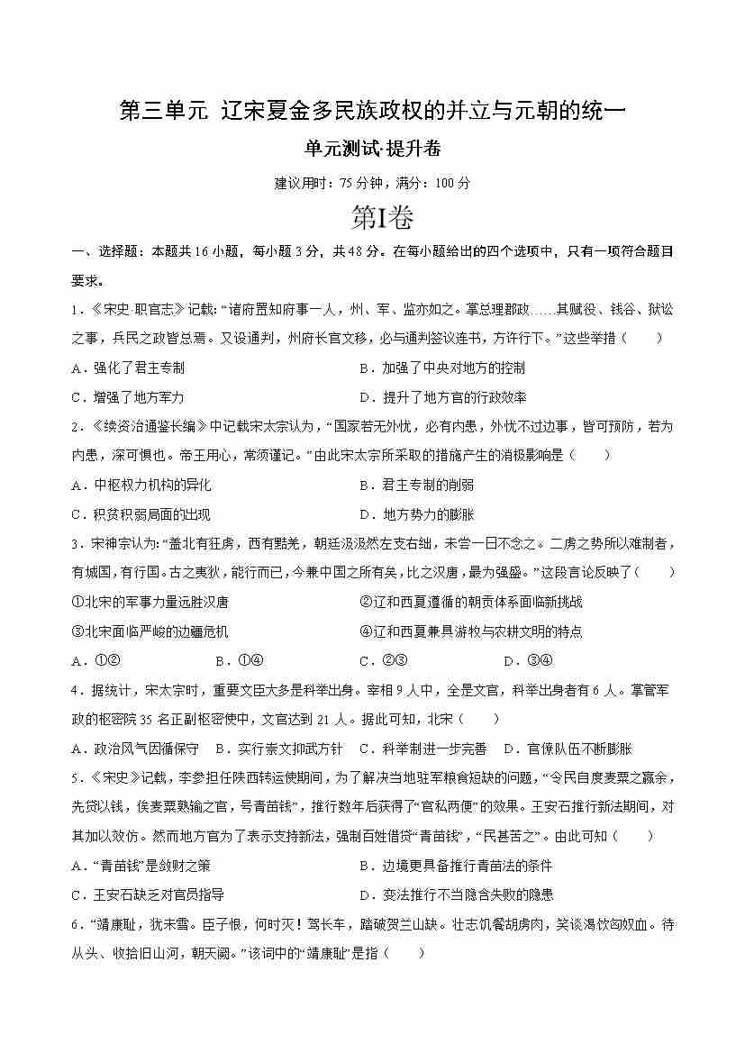 首页 > 全部 > 单元测试 > 第三单元 辽宋夏金多民族政权的并立与元朝的统一(单元测试·提升卷)(考试版A4)