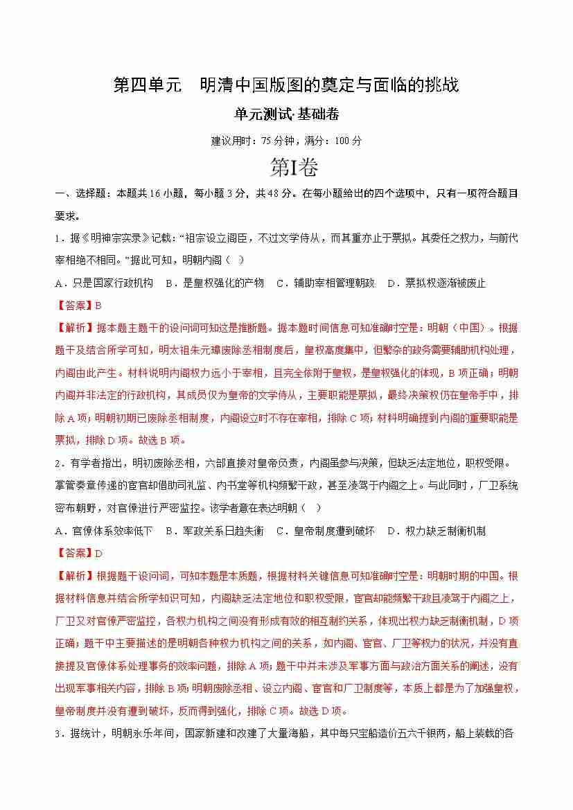 首页 > 全部 > 单元测试 > 第四单元 明清中国版图的奠定与面临的挑战(单元测试·基础卷)(教师版)