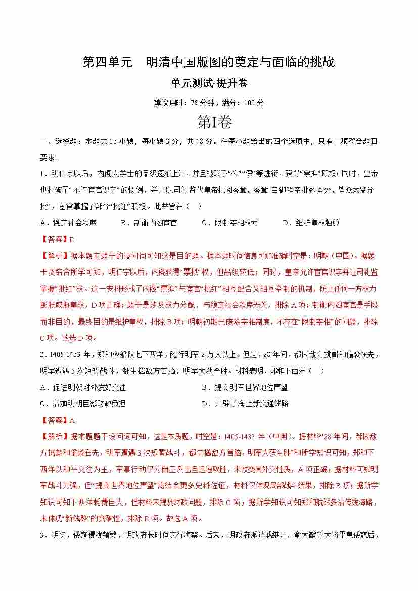 首页 > 全部 > 单元测试 > 第四单元 明清中国版图的奠定与面临的挑战(单元测试·提升卷)(教师版)