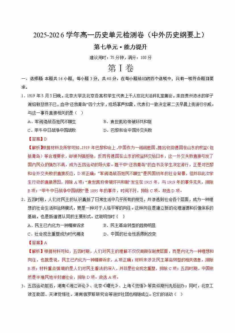 高一历史中外历史纲要(上)第七单元测试·提升卷(教师版)