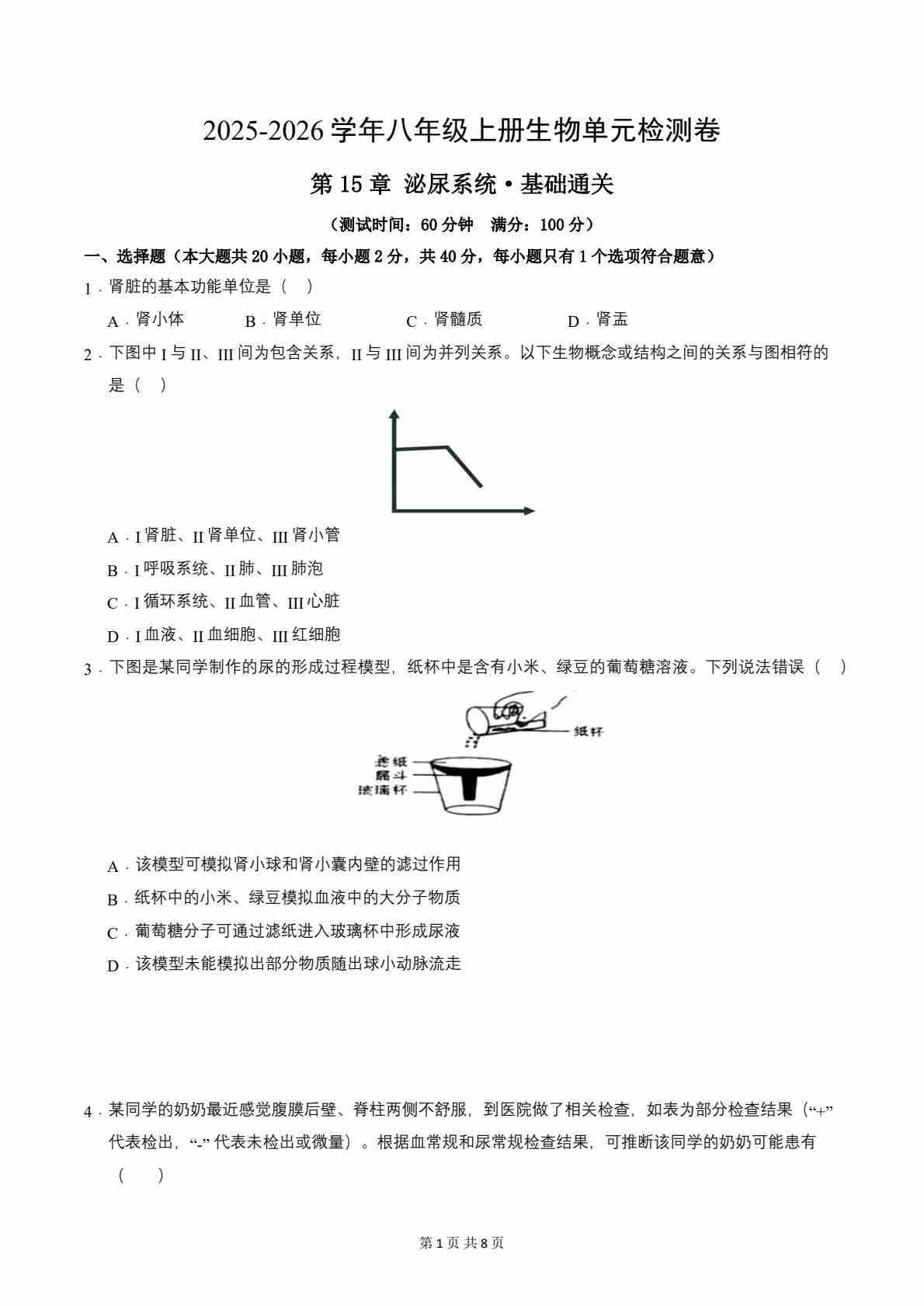 第15章 泌尿系统(单元测试·基础卷)(考试版A4)