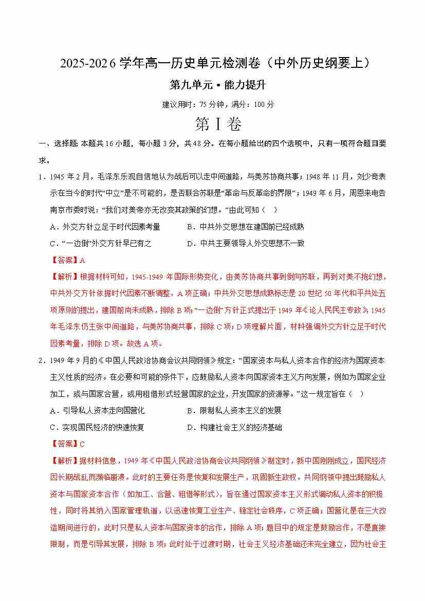 高一历史中外历史纲要(上)第九单元测试·提升卷(教师版)