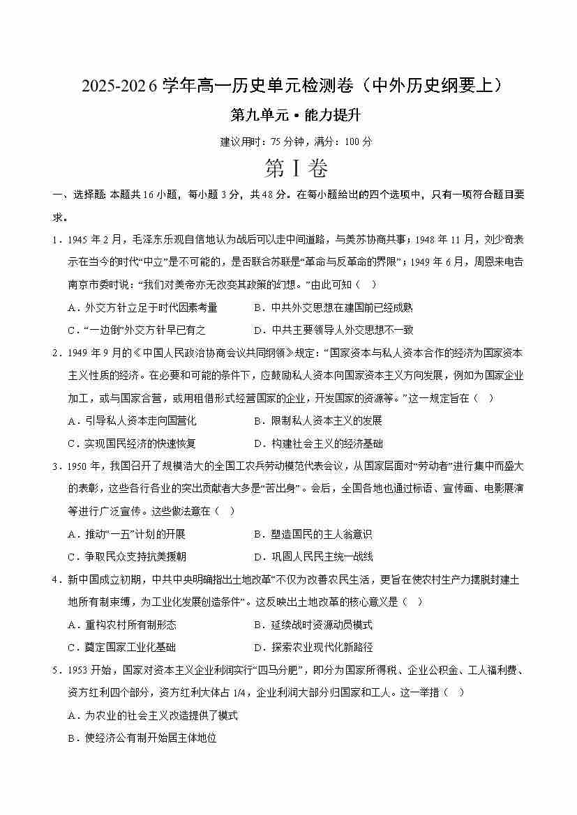高一历史中外历史纲要(上)第九单元测试·提升卷(考试版A4)