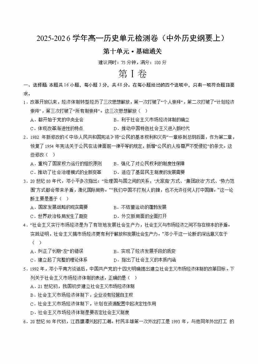 高一历史中外历史纲要(上)第十单元测试·基础卷(考试版A4)