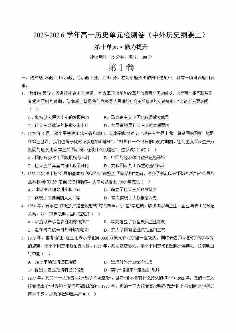 高一历史中外历史纲要(上)第十单元测试·提升卷(考试版A4)