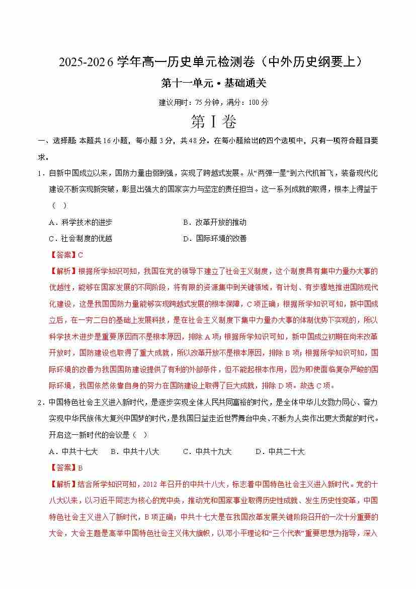 高一历史中外历史纲要(上)第十一单元测试·基础卷(教师版)