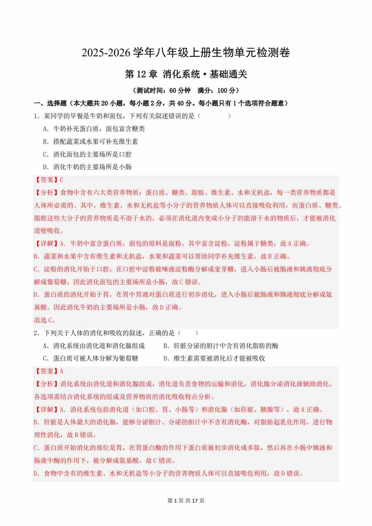 首页 > 全部 > 单元基础卷 > 第12章 消化系统(单元测试·基础卷)(解析版)