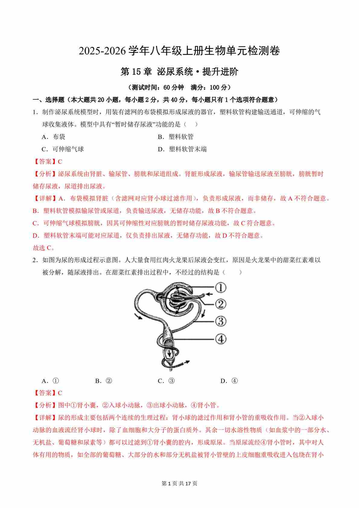 首页 > 全部 > 单元提升卷 > 第15章 泌尿系统(单元测试·提升卷)(解析版)