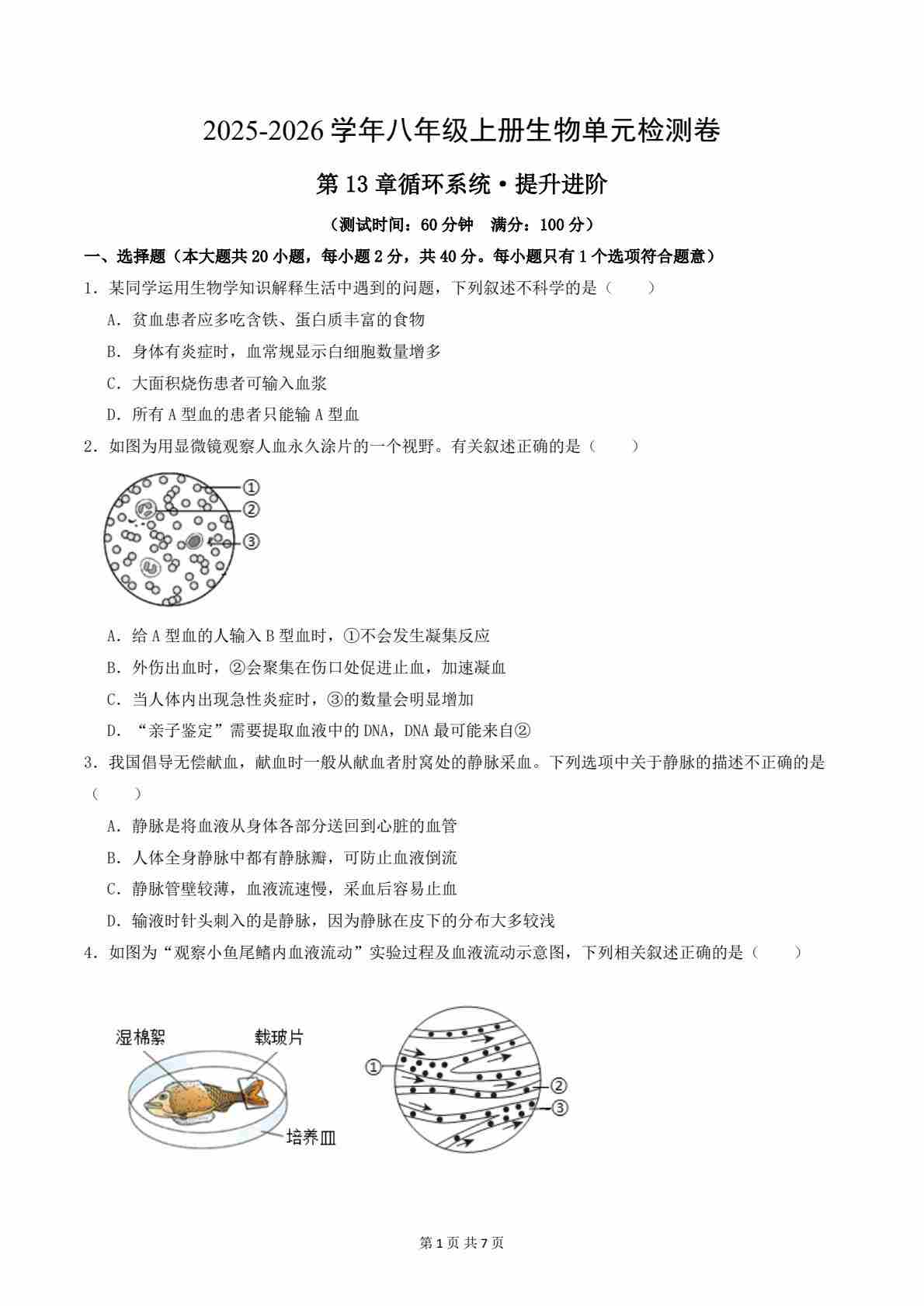 首页 > 全部 > 单元提升卷 > 第13章 循环系统(单元测试·提升卷)(考试版A4)