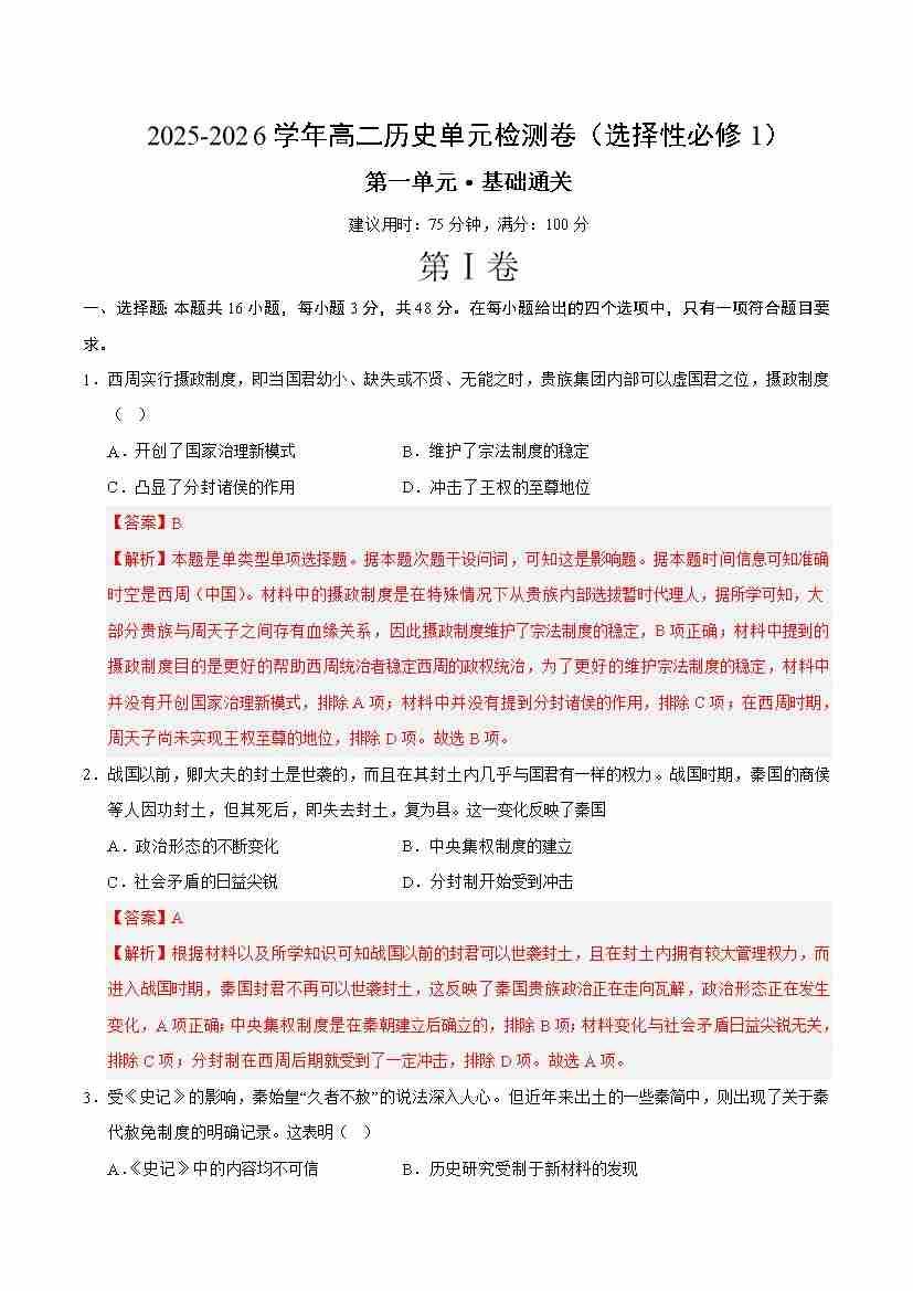 高二历史选择性必修1第一单元测试·基础卷(教师版)