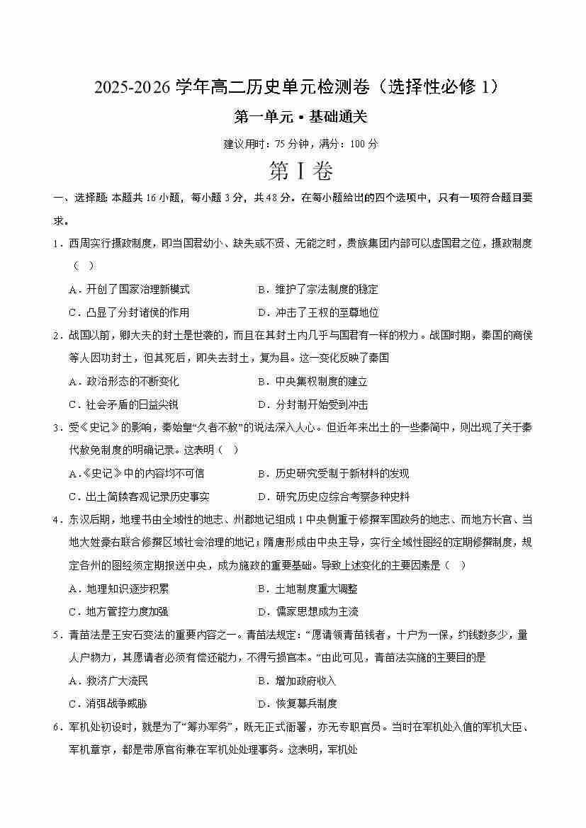 首页 > 全部 > 单元测试 > 高二历史选择性必修1第一单元测试·基础卷(考试版A4)