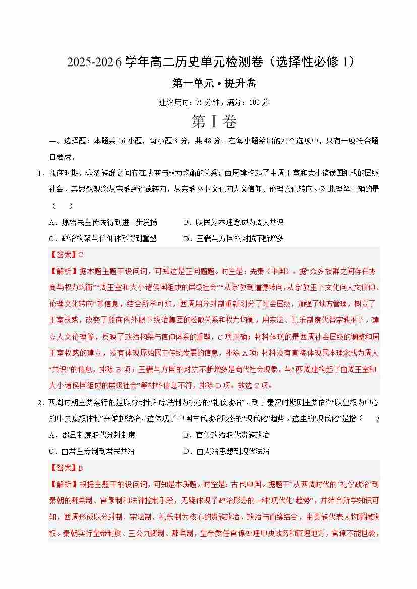 高二历史选择性必修1第一单元测试·提升卷(教师版)