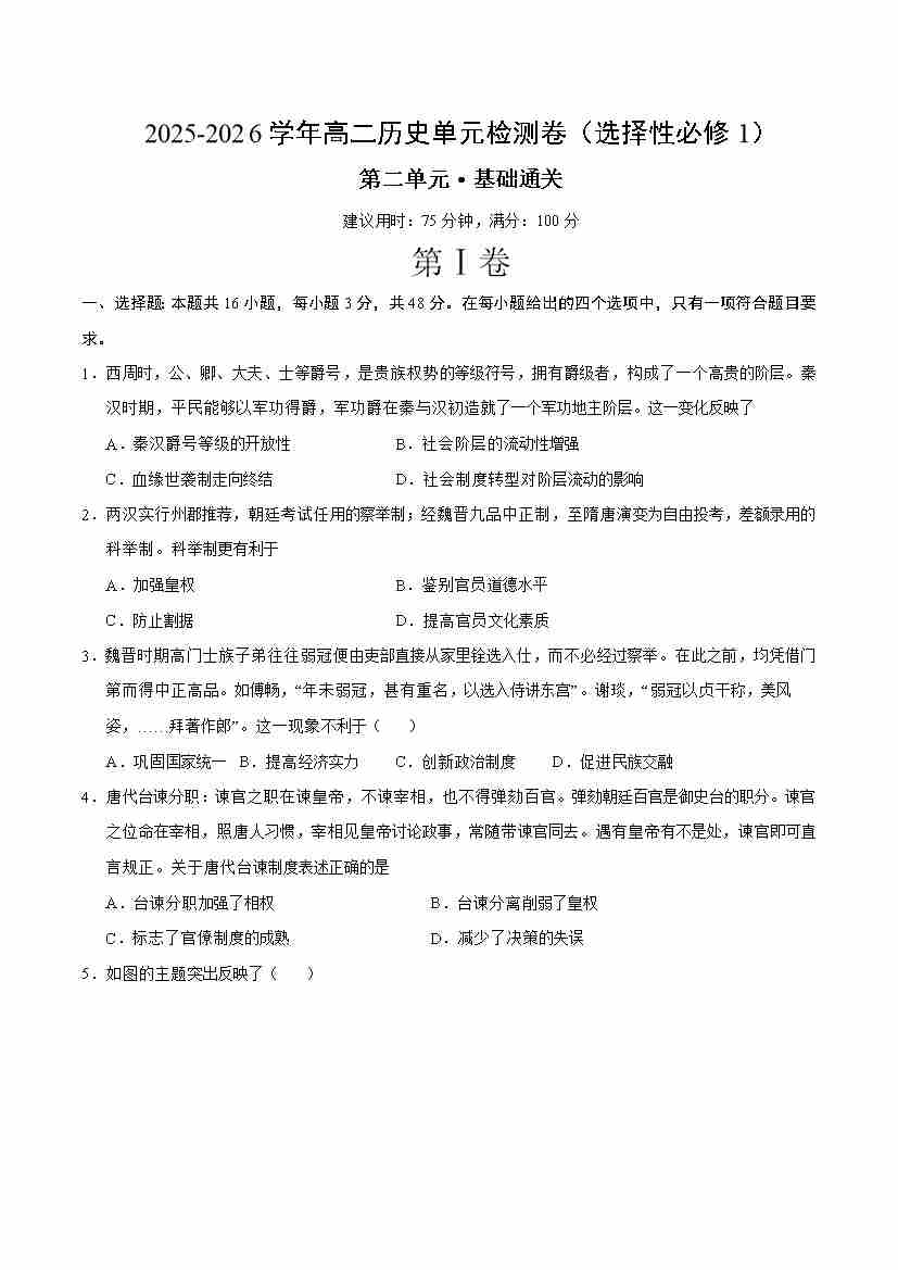 首页 > 全部 > 单元测试 > 高二历史选择性必修1第二单元测试·基础卷(考试版A4)