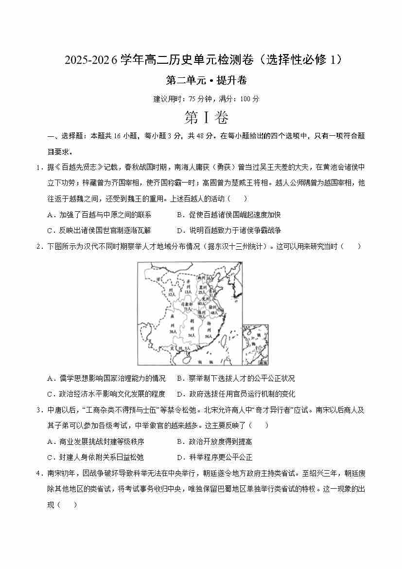 首页 > 全部 > 单元测试 > 高二历史选择性必修1第二单元测试·提升卷(考试版A4)